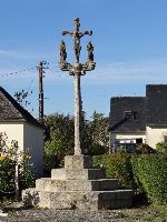 Au croisement de routes, Accès facile, Très visible, Propriété publique, Monument déplacé Trois degrés, plan octogonal, comme le socle. Fût à pans. Croisillon, statues: la Vierge et saint Jean (modernes): 1886. Croix, fleurons-boules godronnés, crucifix. [YPC 1980] |