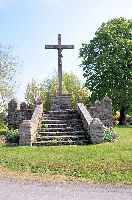 Au croisement de routes, Au coeur d'un bourg, Accès facile, Très visible, Propriété communale, Emplacement original Ensemble monumental, sur une plateforme accessible par un emmarchement à 9 degrés, soubassement en maçonnerie de moellons; entablement en béton; croix en béton (granito), Christ et titulus en fonte. |