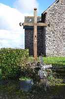 Au croisement de routes, Au coeur d'un bourg, Accès facile, Très visible, Propriété publique Soubassement en maçonnerie de moellons de schiste mauve, plaque de granit encastrée en façade avec gravée la date de 1995. Entablement en dalles de schiste mauve. Croix en bois chanfreinée, niche gril ... |