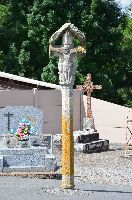 Dans un cimetière, Accès facile, Très visible, Propriété publique, Monument déplacé Fût octogonal à base baguée, fixé dans le sol (?); Croix à fronton à bâtière; face Est: Christ en croix flanqué de la Vierge et Saint-Jean dont les pieds reposent sur un socle orné de palmes; au rever ... |