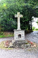 Au croisement de routes, Au coeur d'un lieu-dit, Accès facile, Très visible, Propriété privée, Emplacement original Emmarchement 1 degré sur le pourtour, soubassement en maçonnerie de moellons de schiste, niche en façade, entablement en dalles de schiste, socle en dalles de schiste, croix palis, grecque, monolithe, ... |