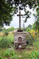 En bord de chemin, Isolé en campagne, Accès facile, Peu visible, Propriété privée Sur un monticule de bloc de pierres tout-venant, croix en bois chanfreinée, date 2010 gravée à la base du fût. |
