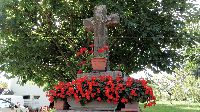 Au croisement de routes, Au coeur d'un bourg, Accès facile, Très visible, Propriété publique, Emplacement original Son soubassement de granit reproduit la forme d’autel rectangulaire. Croix en béton, Christ en fonte. |