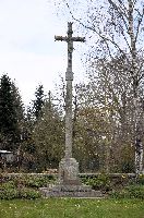 En bord de route, Accès facile, Très visible, Propriété publique, Monument déplacé Adossés à un talus, emmarchement 2 degrés en ciment en façade, socle en béton, fût cylindrique, croix panneau et à bâtière, avec en façade sculptés en bas relief, le Christ en croix surmonté d'un titu ... |